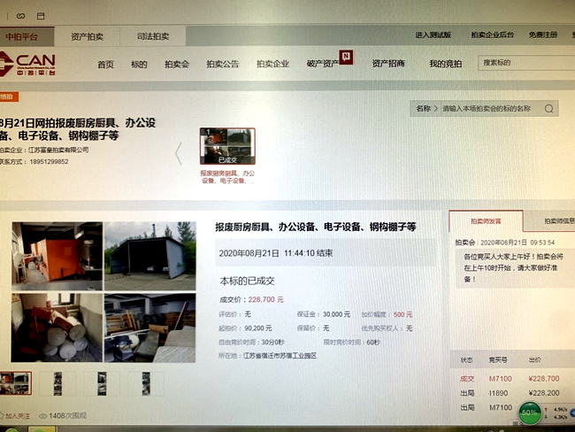 8月21日上午10時(shí),城發(fā)公司報(bào)廢廚具、辦公設(shè)備、電子設(shè)備、鋼構(gòu)棚子等物資網(wǎng)上拍賣開始,7家競(jìng)買人,經(jīng)過(guò)1小時(shí)44分10秒244次的緊張激烈競(jìng)價(jià),最終以228700元成交標(biāo)的,比評(píng)估價(jià)90200元高出138500元,溢價(jià)率153.55%。