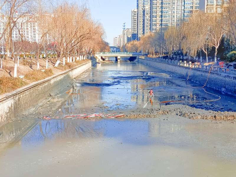 園區(qū)利民河全長1.1公里、寬20米,為區(qū)內景觀河。經(jīng)前期摸排,河道內淤泥沉積較多,影響河道自凈能力。城發(fā)公司克服冬季氣溫低、斷面長、施工難等不利因素,采用泥漿泵配合高壓水槍射水,管道封閉運輸?shù)氖┕し椒ǎ謇碛倌嗉s8500立方米,高效完成河道清淤工作。