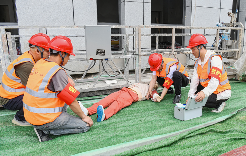 應(yīng)急演練現(xiàn)場模擬了一名施工人員,在安裝外墻鋁板作業(yè)過程中,因違反安全技術(shù)交底要求擅自改變作業(yè)程序,不慎從高處墜落受傷。安全員發(fā)現(xiàn)該情況后,立即上報,隨即應(yīng)急救援預(yù)案迅速啟動,各小組聯(lián)合行動,通過科學(xué)有序的救援,及時將傷者送醫(yī)救治,整個演練過程井然有序。通過演練提高了員工應(yīng)急自救能力,減少高空墜落事故的發(fā)生,并在發(fā)生時能及時有效地進(jìn)行自救和互救。