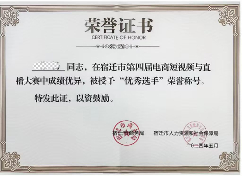 榮譽證書得獲得不僅是對參賽選手個人努力和才華的認可,也是對蘇宿電商園在電商領域?qū)I(yè)人才培養(yǎng)和推動電商直播行業(yè)發(fā)展的成果的肯定。