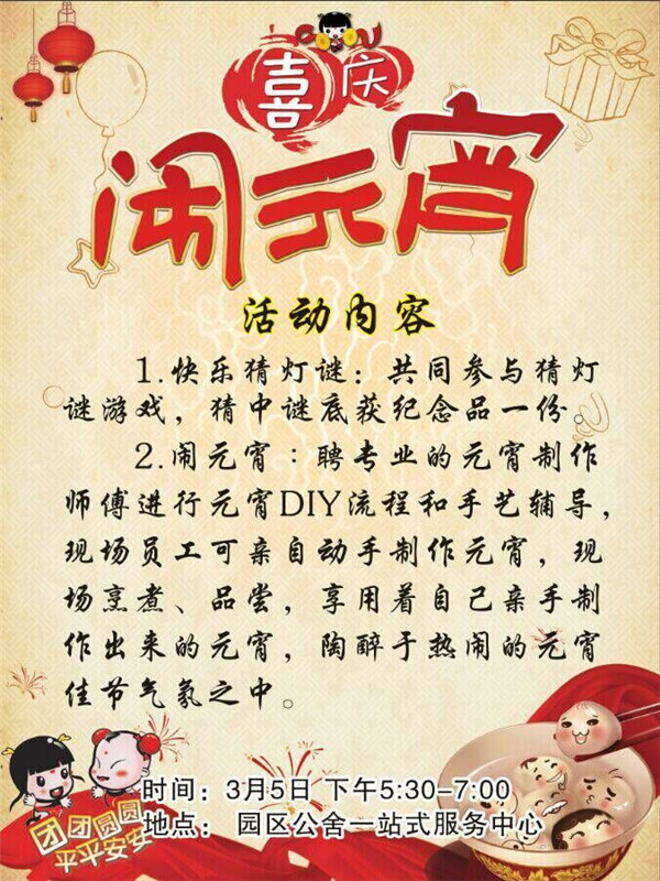 元宵節(jié)期間,園區(qū)公舍、蘇宿明日鄰里中心均為廣大園區(qū)居民奉上了精彩活動,有獎品多多的“快樂猜燈謎”,還有專業(yè)的元宵DIY現(xiàn)場輔導,歡迎園區(qū)居民和工友們前來參加。
