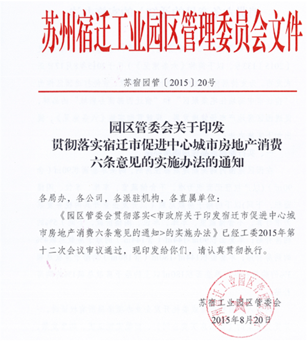 8月20日,在市政府出臺《宿遷市促進(jìn)中心城市房地產(chǎn)消費(fèi)六條意見》之后的第三天,園區(qū)率先出臺了《園區(qū)管委會貫徹落實(shí)<市政府關(guān)于印發(fā)宿遷市促進(jìn)中心城市房地產(chǎn)消費(fèi)六條意見的通知>的實(shí)施辦法》。